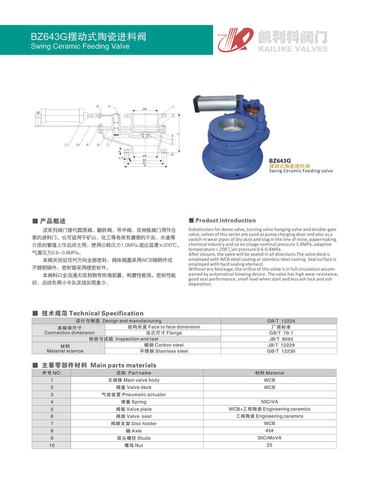 2、BZ643G擺動式陶瓷進(jìn)料閥在關(guān)閉后任何方向全部密封。閥體閥蓋采用WCB鑄鋼件或不銹鋼鑄件。密封面采用硬密封件。